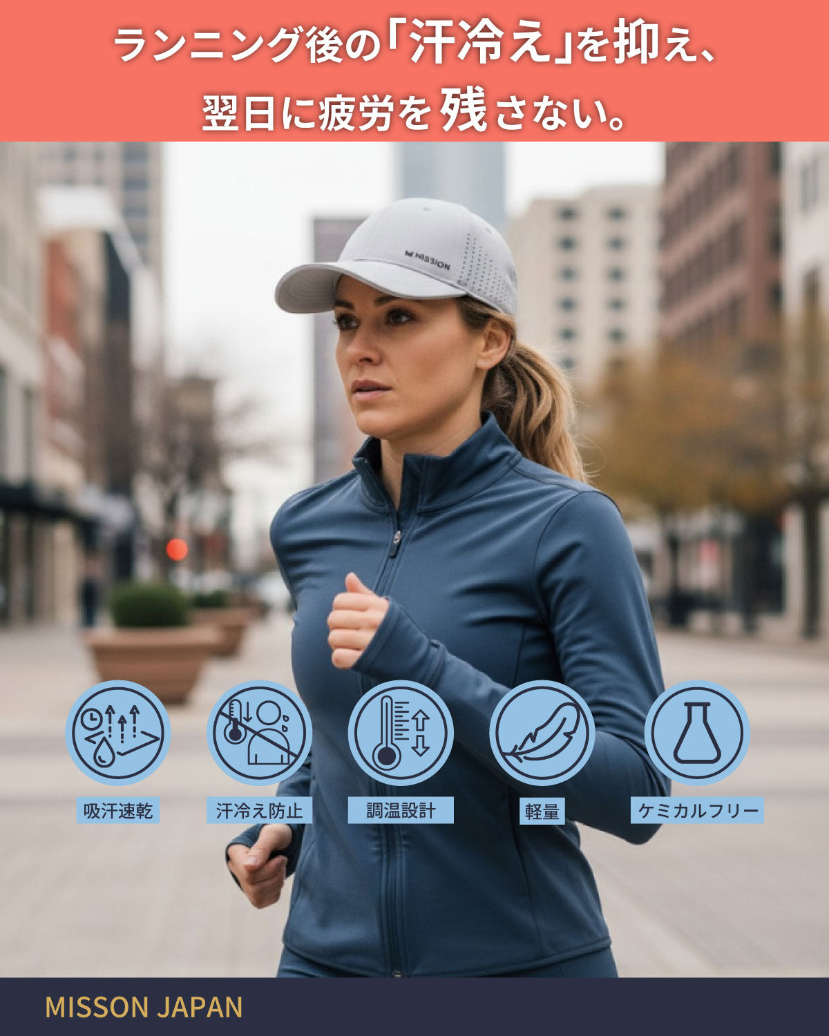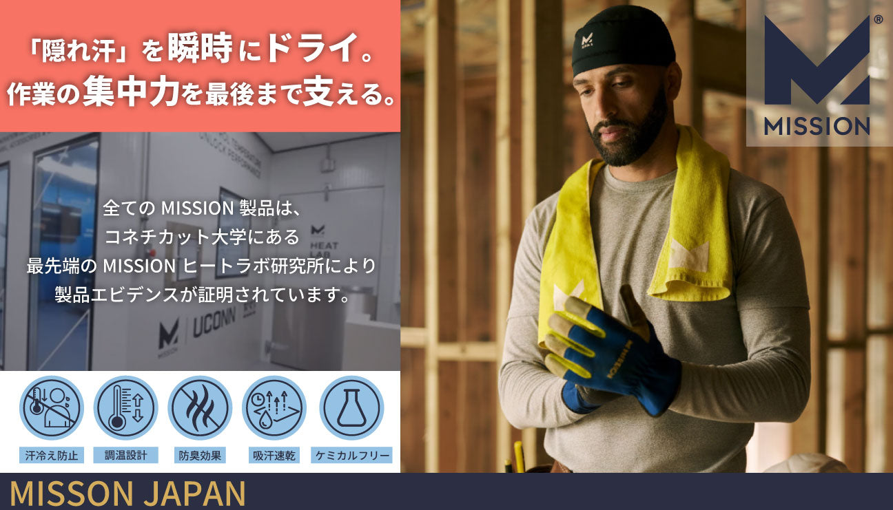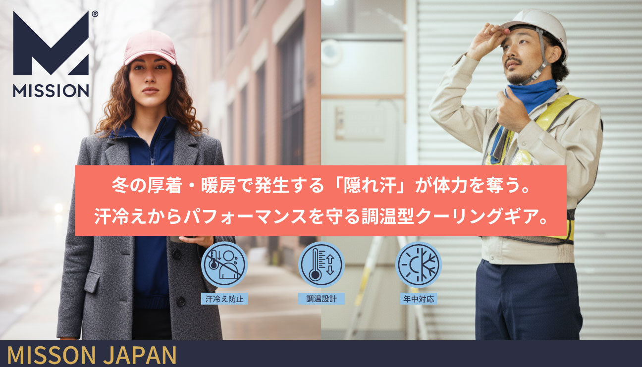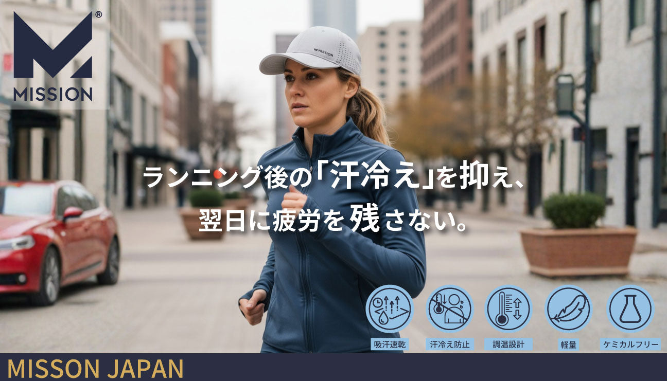 MISSIONは、汗を瞬時に蒸発させ、秋の運動でもドライでさらっと汗冷えを防ぐ「HydroActive™(ハイドロアクティブ)」技術を搭載したゲイター、帽子、タオル、シャツなどの製品を提供しています。