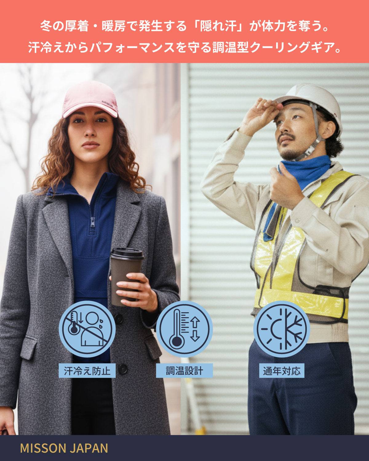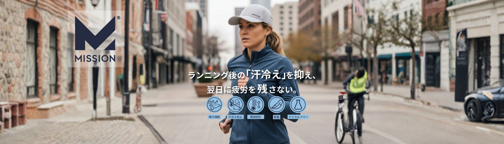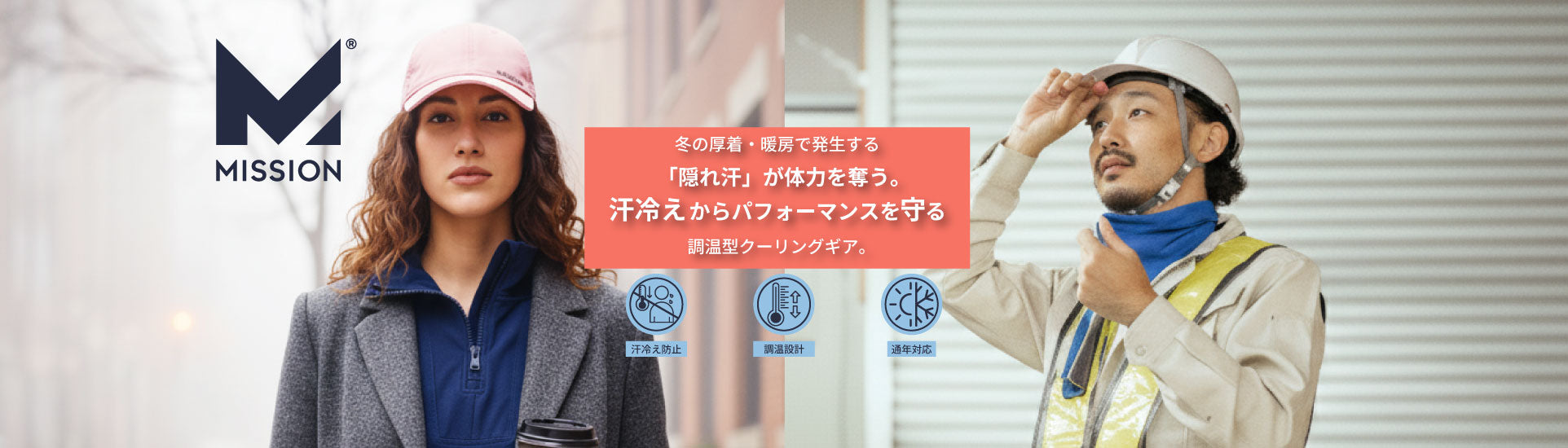 MISSIONは、汗を瞬時に蒸発させ、秋の運動でもドライでさらっと汗冷えを防ぐ「HydroActive™(ハイドロアクティブ)」技術を搭載したゲイター、帽子、タオル、シャツなどの製品を提供しています。