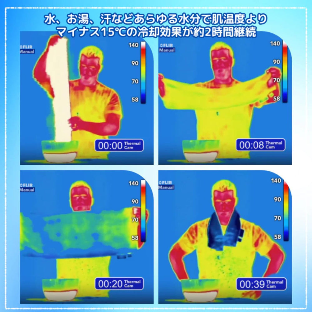 - 持続的な冷却効果: 一度冷却効果が発動すると、水分が蒸発するまで最大2時間持続します。水分が乾いても、再度濡らすだけで何度でも冷却効果を再発動でき、繰り返し使用可能で経済的です。